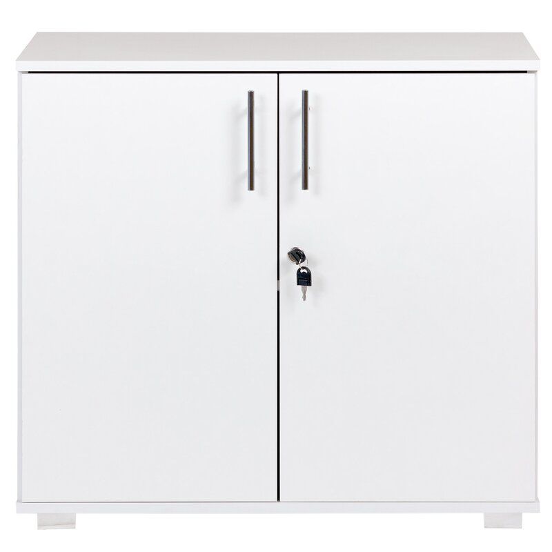 O clássico que nunca sai de moda. Armário baixo para escritório com duas portas e prateleira interna, possui duas portas de giro com fechadura na direita e trinco na esquerda.